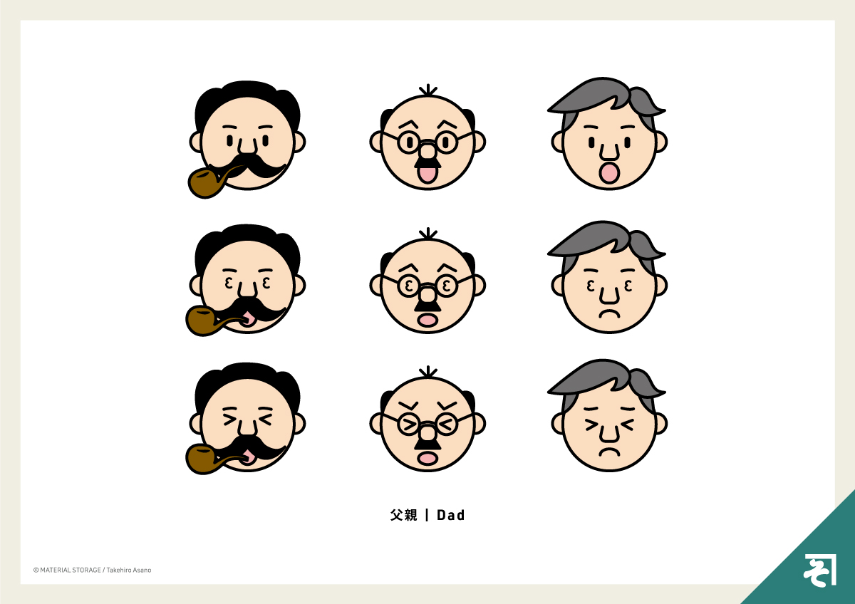 昭和を感じるお父さん達の顔イラストです。表情のパーツ違いも作ってあります。父の日のアイキャッチなどにおすすめです。調整はお好みでどうぞ。波平さんみたいなお父さん今いませんね。パイプを加えた人は現実では見たことないや。
