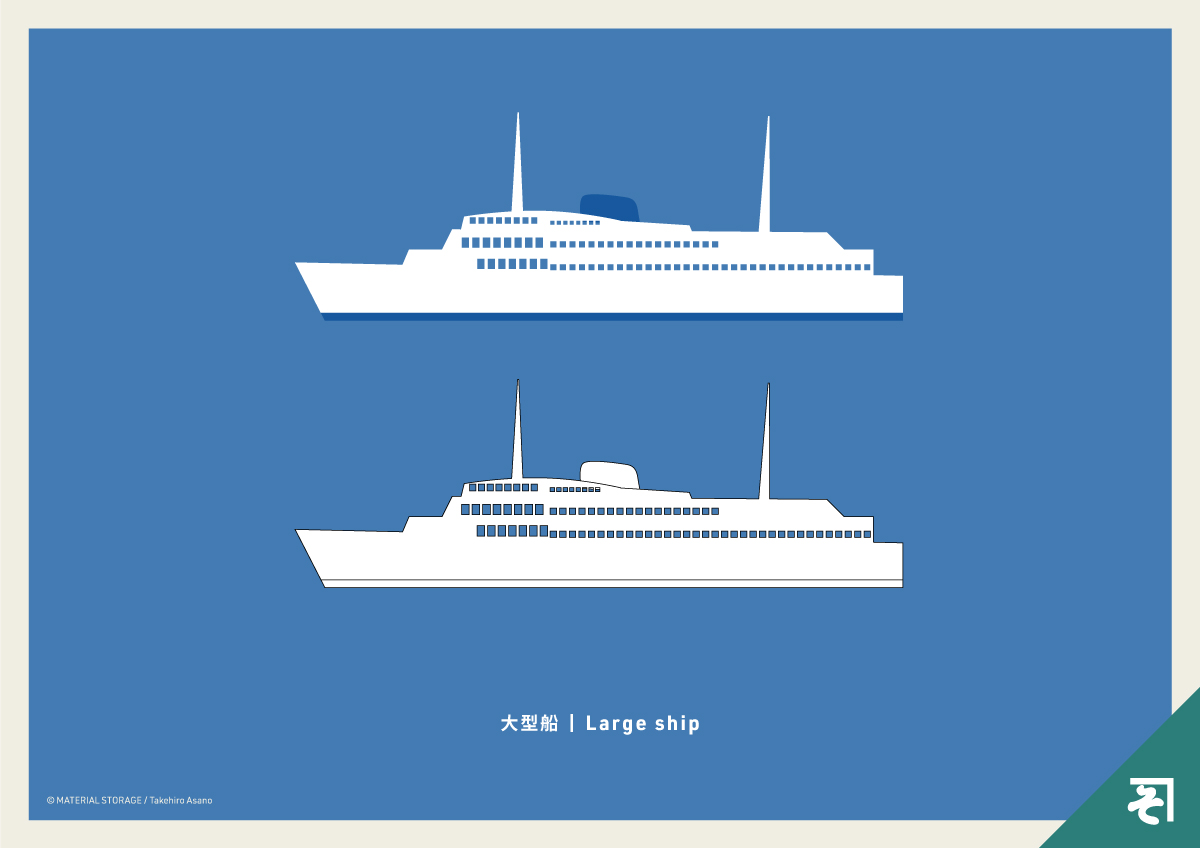 側面から見た大型船を、シンプルなラインで表現したイラストです。乗り物としての存在感はそのままに、扱いやすいデザインにまとめました。海や旅に関連するデザインのアクセントとしても。調整はお好みで。