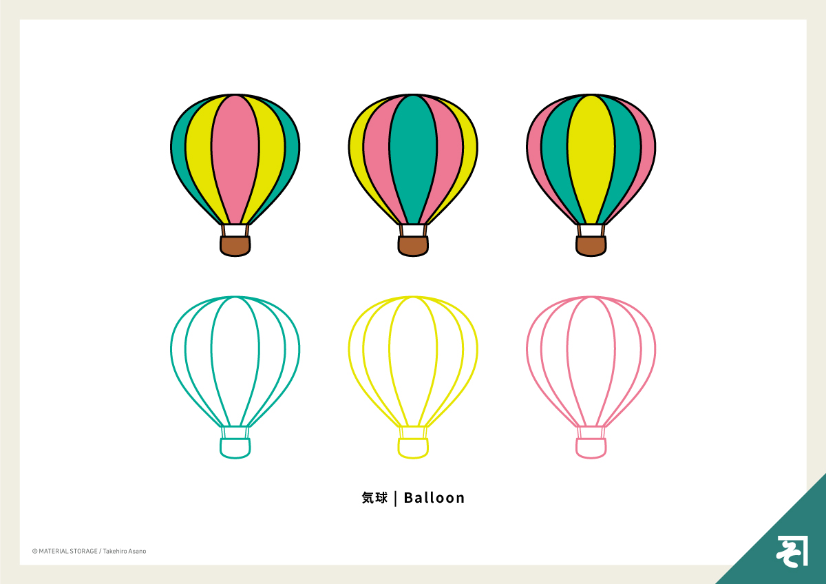 フラットな気球のイラスト。シンプルながらも、空を遊覧する乗り物としてのワクワク感を伝えます。様々な媒体に馴染みやすく、他のモチーフとも組み合わせやすいデザインです。調整はお好みでどうぞ。