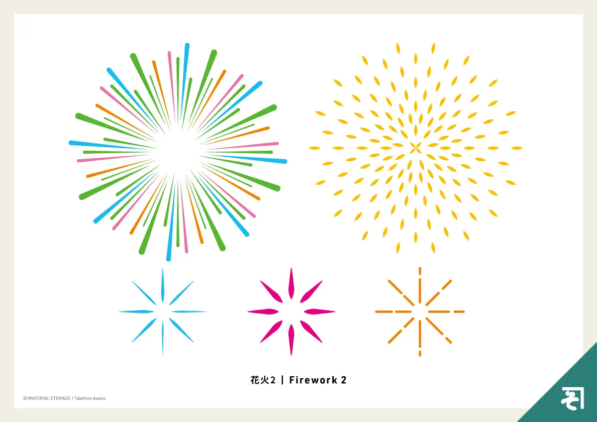 夏の夜空を彩る花火を、シンプルな線で表現したイラストです。パート2です。こちらはどちらかと言うとスパークルな感じです。花火以外にも使えそうです。太さや色などお好みで調整してください。