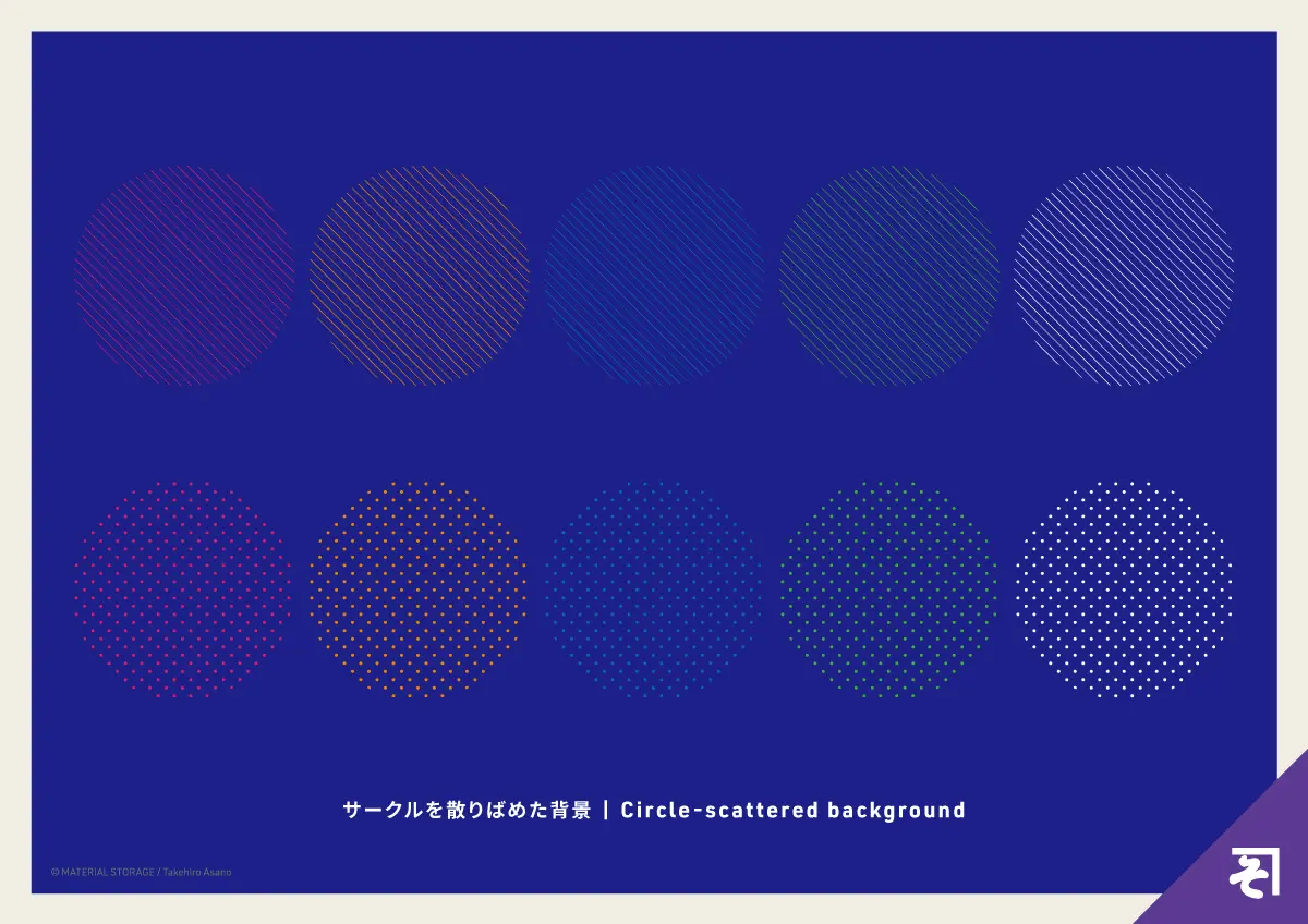 ドットやラインといったシンプルな幾何学模様を、円の中に閉じ込めて構成した背景パターン。一つ一つの円はシンプルですが、集まることでリズミカルで楽しい印象になります。配色次第でレトロポップな雰囲気にもなりそうです。