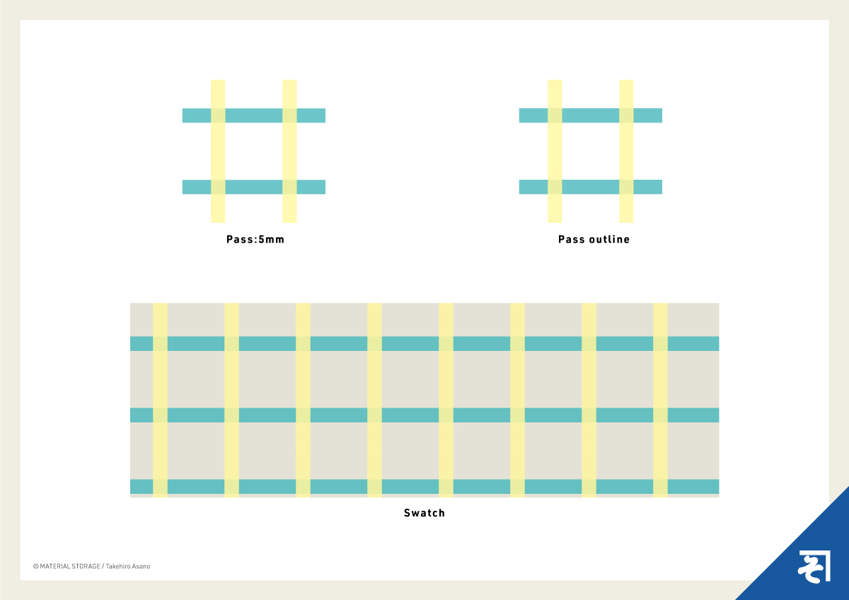 使い勝手の良い、シンプルな2色のチェック柄パターンです。ただ線を交差させるだけでなく、不透明度を80%にして重なる部分の色の変化を表現しているのがポイント。データはスウォッチに線の状態で登録されているため、後からのカスタマイズも容易です。斜めにするには、アピアランスの変形で「オブジェクトの変形」のチェックを外してくださいね。色や線幅の数値など調整はお好みで。余談ですが、某マヨネーズの赤い網目やシャウエッセンのストライプ柄も商標登録されているなんて、デザインの世界は奥深いですね。