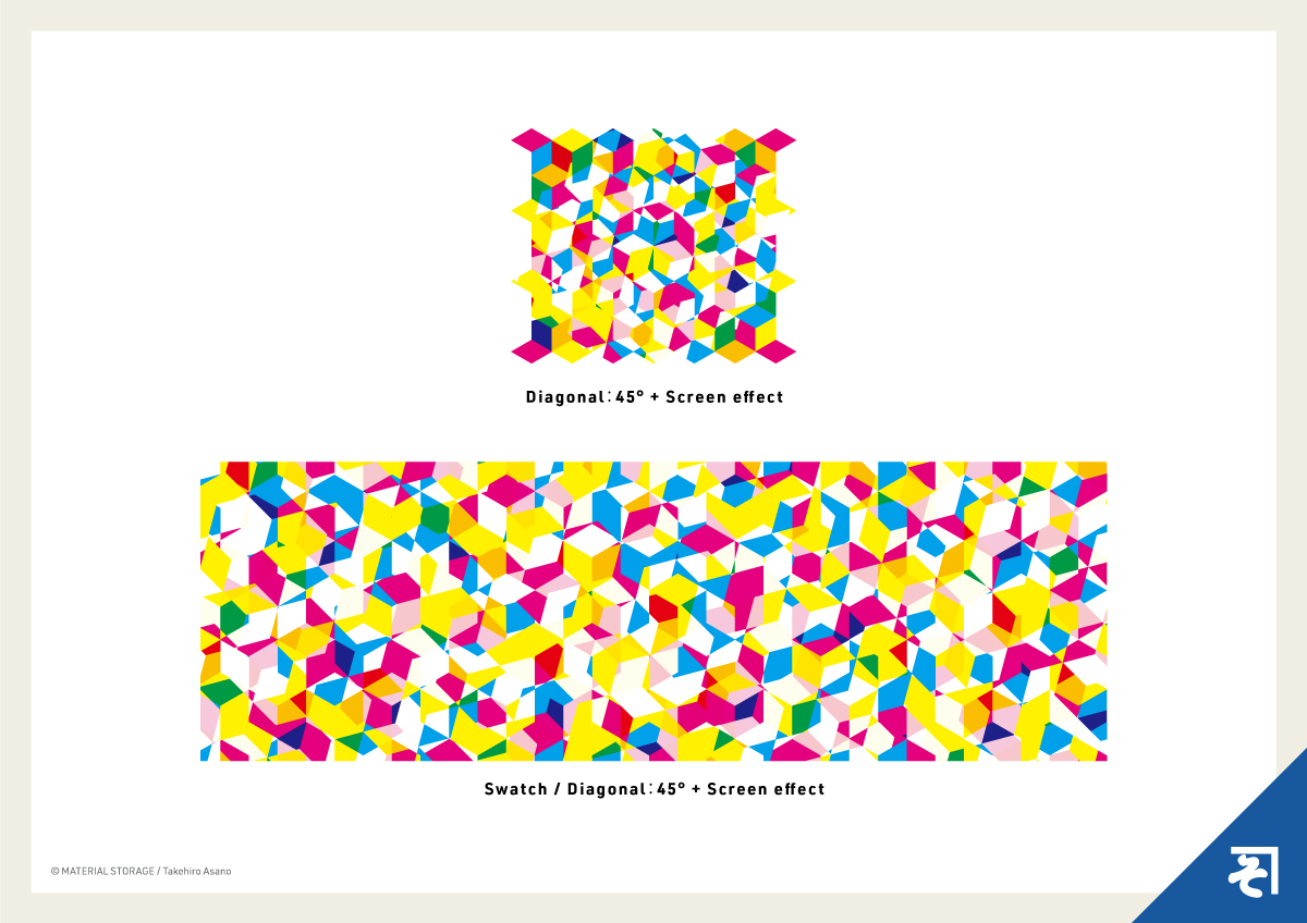 六角形をベースにしたキューブで構築。ビビットパターンの上にもう1枚重ねて、アピアランスの変形で角度を調整しています。さらに描画モードをスクリーンにすると、ギラギラに。ギラギラさせたい時にどうぞ。トーンや色などの調整はお好みで。