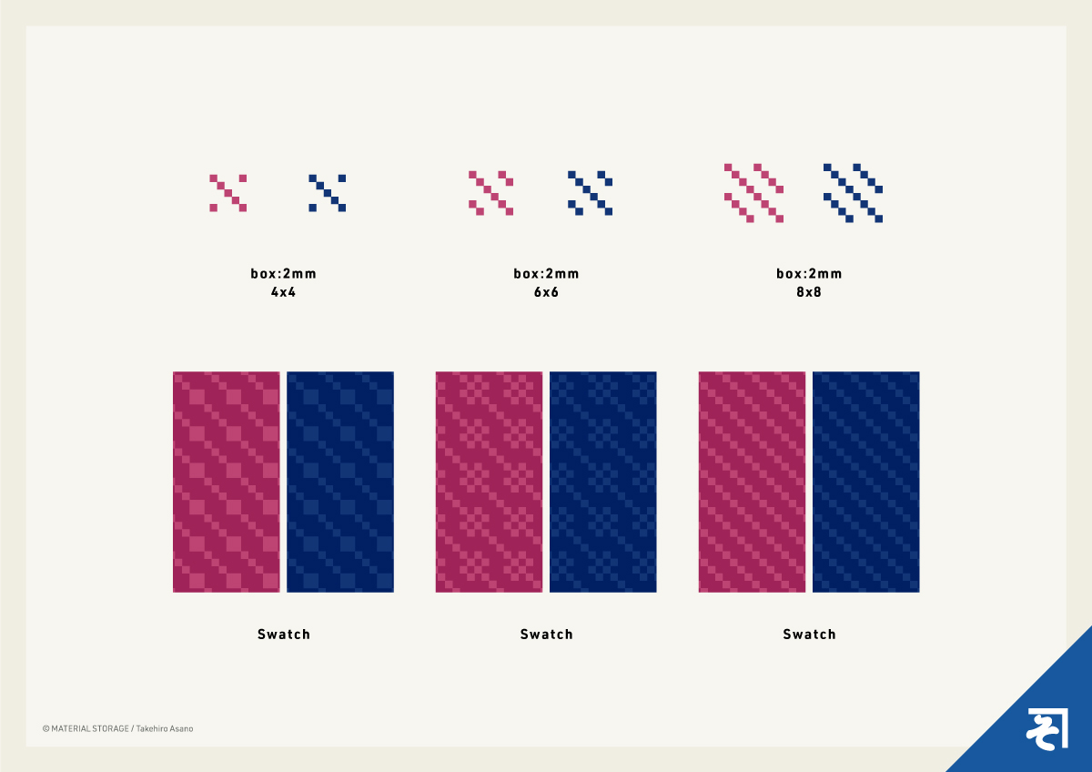 「シンプル」な「ドット」柄が欲しい時、ただ円を並べるだけでなく、こんな風にボックスを「斜め」に配置してみるのも面白いですね。一工夫加えるだけで、ぐっと「可愛い」雰囲気になります。このパターンの魅力は、その拡張性の高さ。サンプルでは4×4、6×6、8×8と「ドット」の数を変えたものをご用意しましたが、この数を変えるだけで柄の印象がガラリと変わります。ぜひお好みでいろいろと調整してみてください。