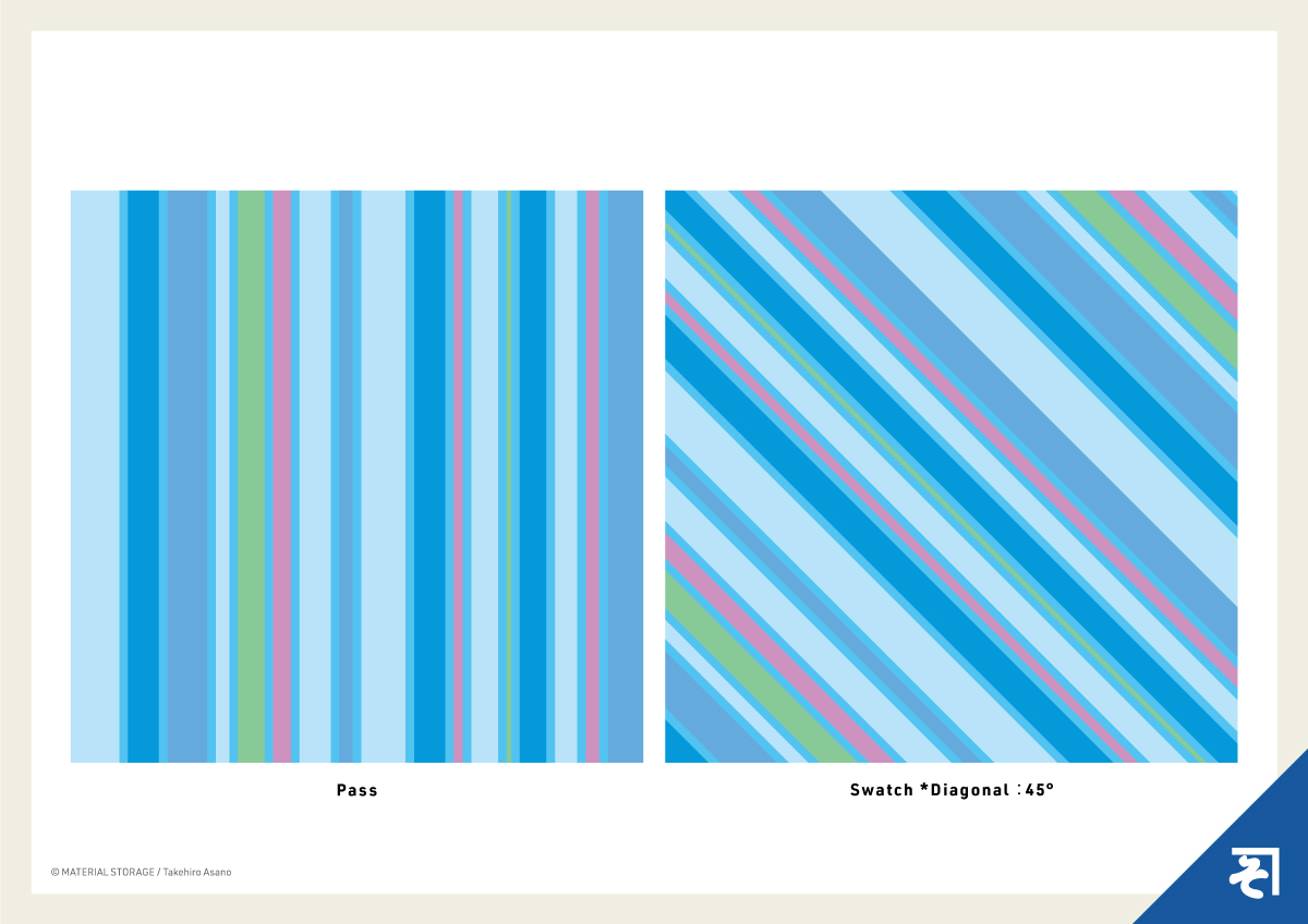 青系で爽やかにまとめたカラフルなストライプパターンです。シャツなどの生地を意識して構築。ホワイトデーや父の日などのイベント系に合いそうです。斜めにするにはアピアランスの変形で「オブジェクトの変形」のチェックを外すのが簡単です。色や配置などの調整はお好みで。
