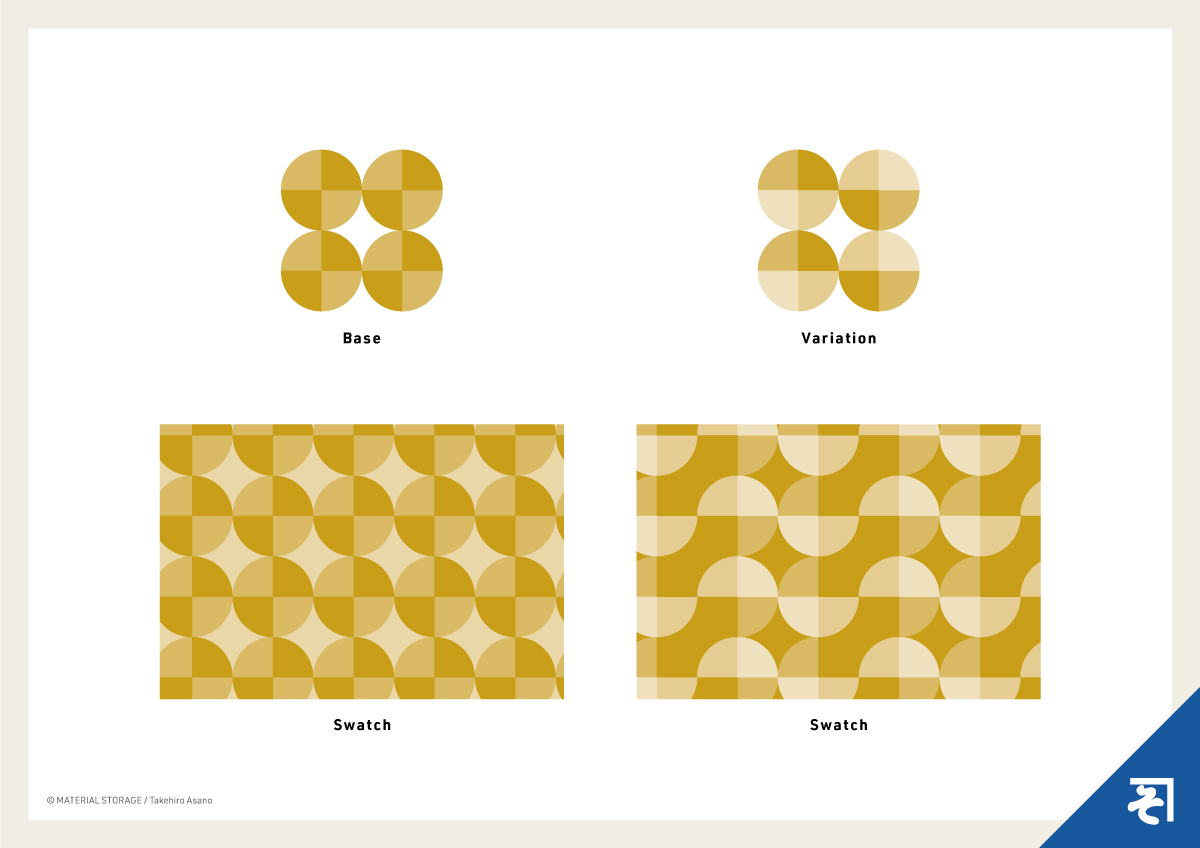 20mmの円を4分割して構成したリズミカルなパターンです。幾何学模様を意識して作成しています。トーンを変えたバリエーションも。色などの調整はお好みでどうぞ。